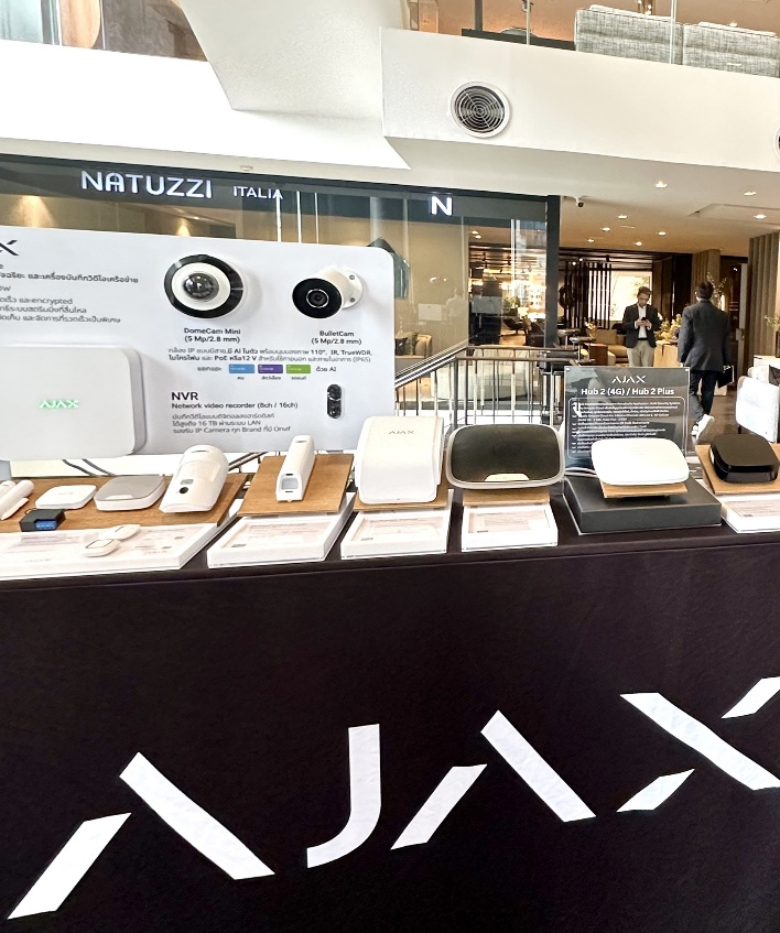 ภายในงาน AJAX ได้มีโอกาสนำเสนอเทคโนโลยีระบบรักษาความปลอดภัยแบบไร้สาย ที่ได้รับการรับรองมาตรฐานระดับสากลจากยุโรป ครอบคลุมโซลูชันด้านความปลอดภัย ที่หลากหลาย ไม่ว่าจะเป็น