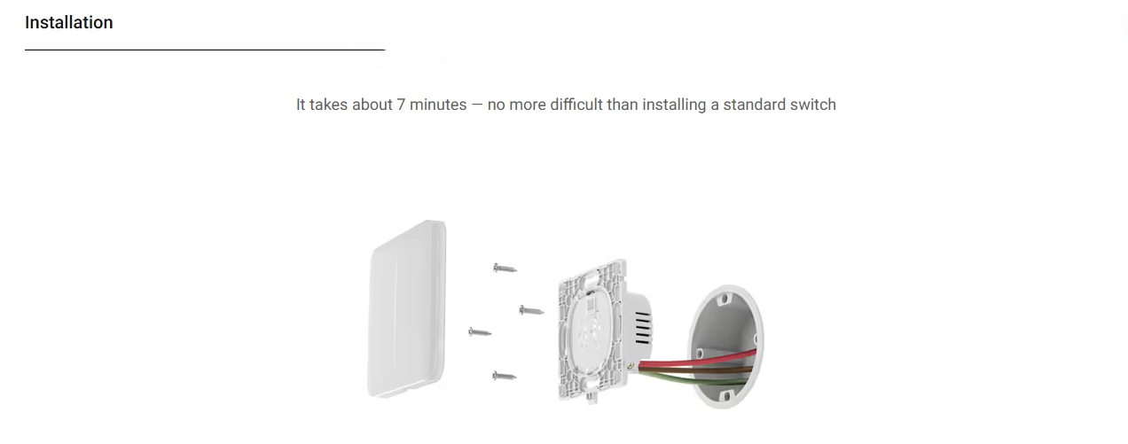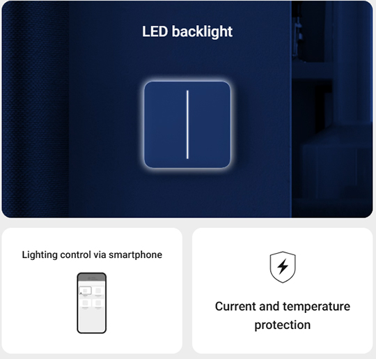 LightSwitch can be added to the system via QR. It is configured in the app with a few clicks. No neutral is required to power LightSwitch. The depth of LightCore is 25 mm. The smart switch can be installed instead of the old switch without replacing the mounting box and changing the wiring. Color touch panels are quickly replaced without powering down the switch.