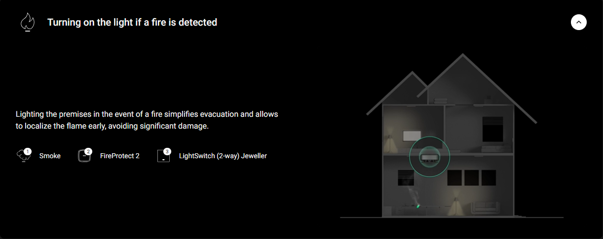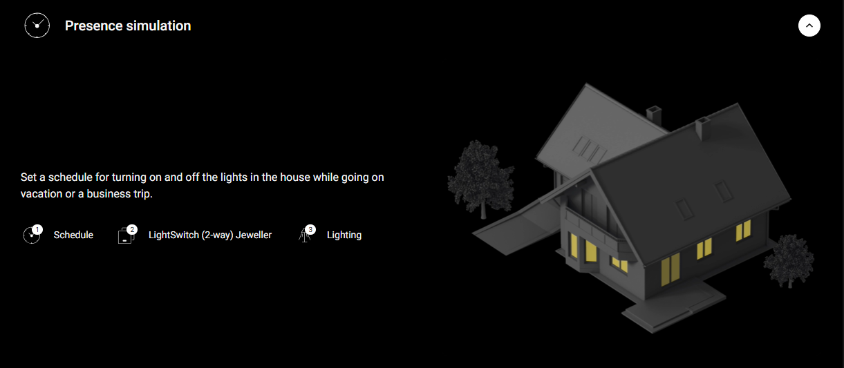 Set the light to turn off automatically when arming the system or in case of an emergency. Or turn on the light according to a schedule.