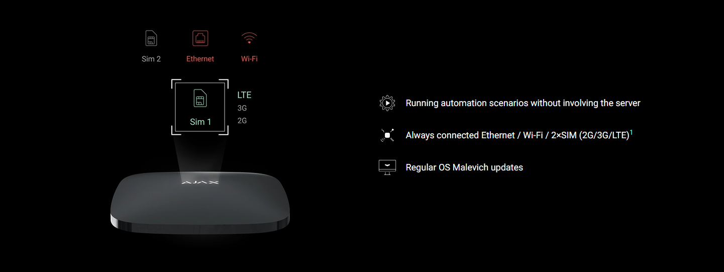 LightSwitch capabilities are provided by the hub — the brain of the Ajax system. With one click, the smart switch is paired with the hub in the app. Hub runs on OS Malevich, a real-time operating system developed by Ajax. OS Malevich is extremely stable, immune to viruses, and protected from cyberattacks.