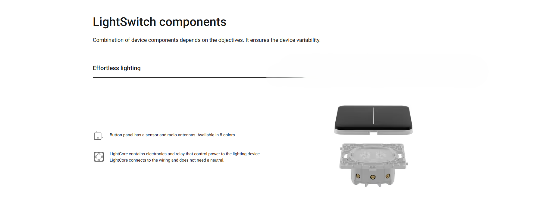 LightSwitch smart switches can be used separately or combined with Outlet. Devices have the same frame design and color shades and can be installed into Frame.