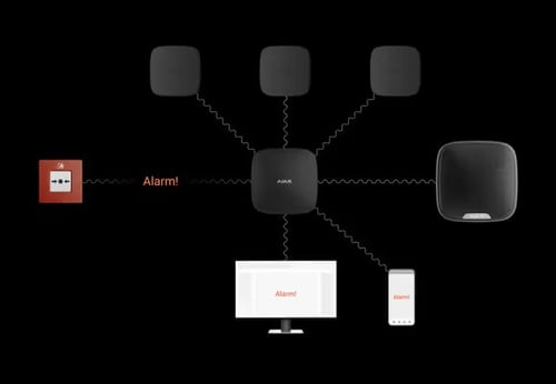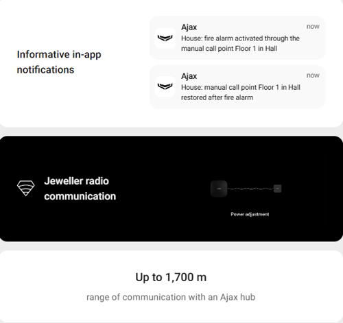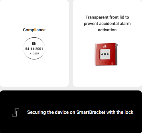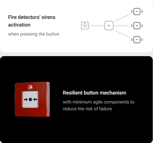 ManualCallPoint (Red) Jeweller is a fast and straightforward way for anyone to activate the fire alarm. Pressing the button triggers the built-in sirens of all fire detectors in the system and informs the users. Meanwhile, the central monitoring station (CMS) receives the alarm and calls emergency services. All the data is instantly available in Ajax apps: which device was triggered, when, and where. In a life-endangering situation, Ajax innovative features follow an alarm in seconds: automation scenarios de-energize the facility, turn the emergency lights, and unlock the exits.