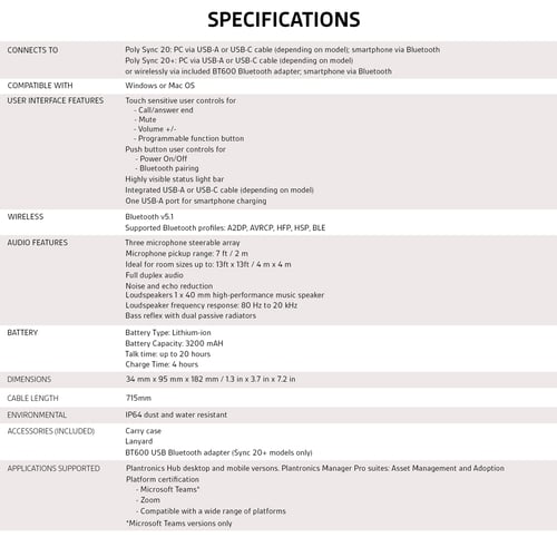 - Bluetooth USB Adapter ( Poly Sync 20+ only )